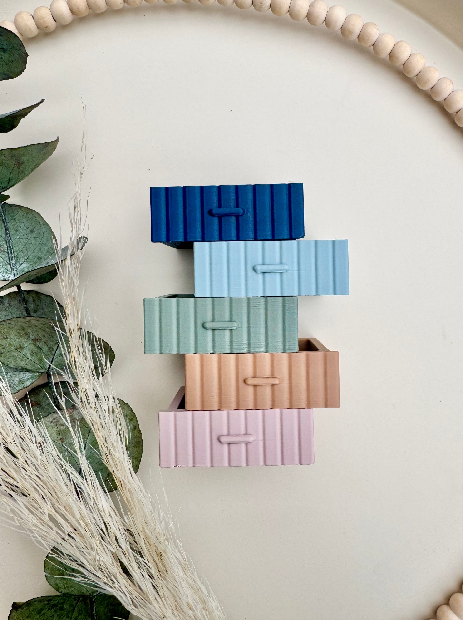 Mach deinen gegossenen Mini-Strandkorb komplett – mit diesen liebevoll gestalteten, 3D-gedruckten Mini-Schubladen! Die kleinen Laden passen perfekt in das untere Fach des Strandkorbs (passend zur Silikonform) und sind in verschiedenen sanften Farben erhältlich.