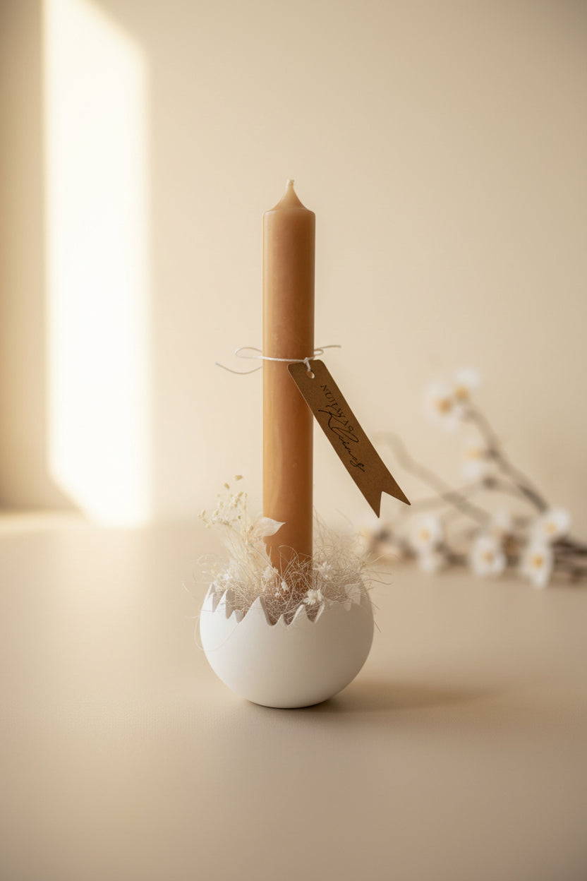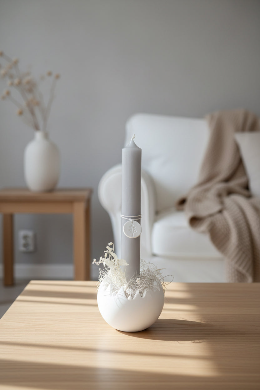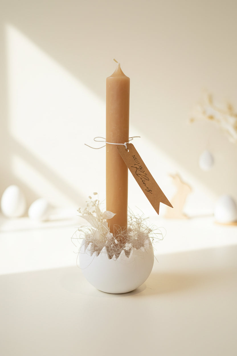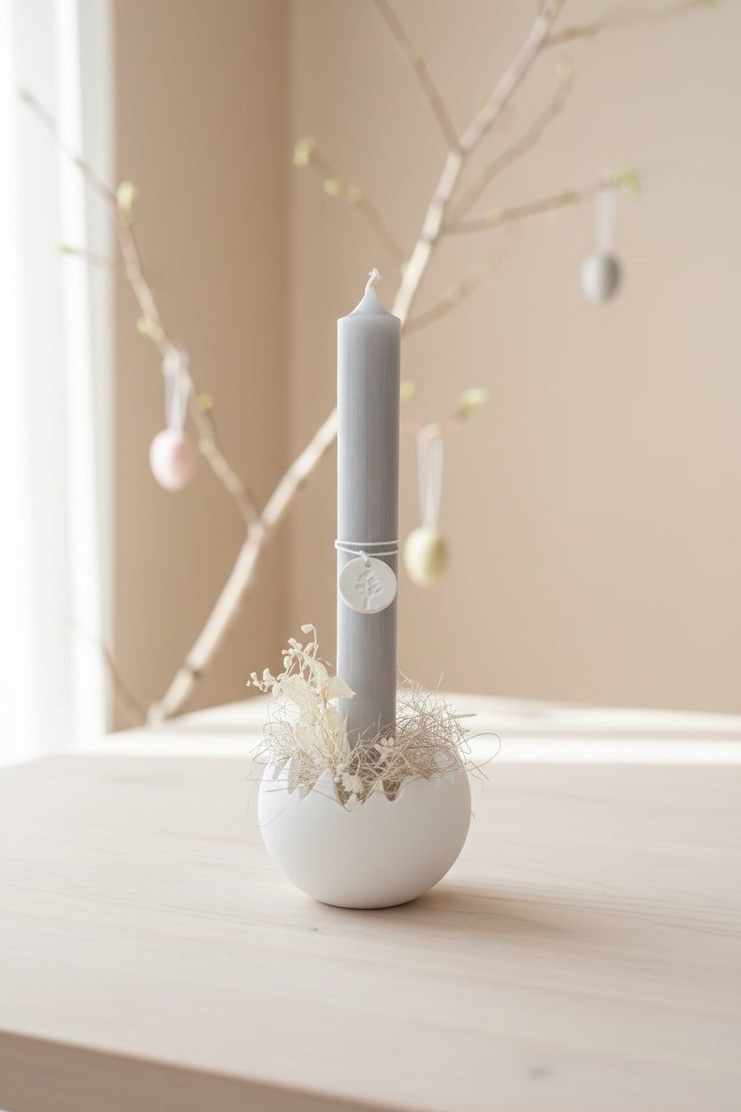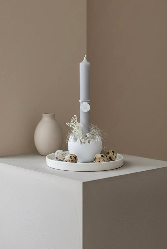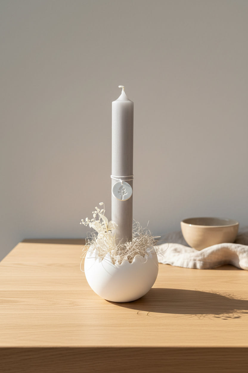 Ob aus Raysin, Keraflott oder Gießbeton – die gegossene Eierschale wirkt schlicht, elegant und passt perfekt zu natürlicher Osterdekoration mit Zweigen, Trockenblumen oder Wachteleiern. Besonders schön kommt der Kerzenhalter auf einem Tablett oder als Teil eines kleinen Osterarrangements zur Geltung.