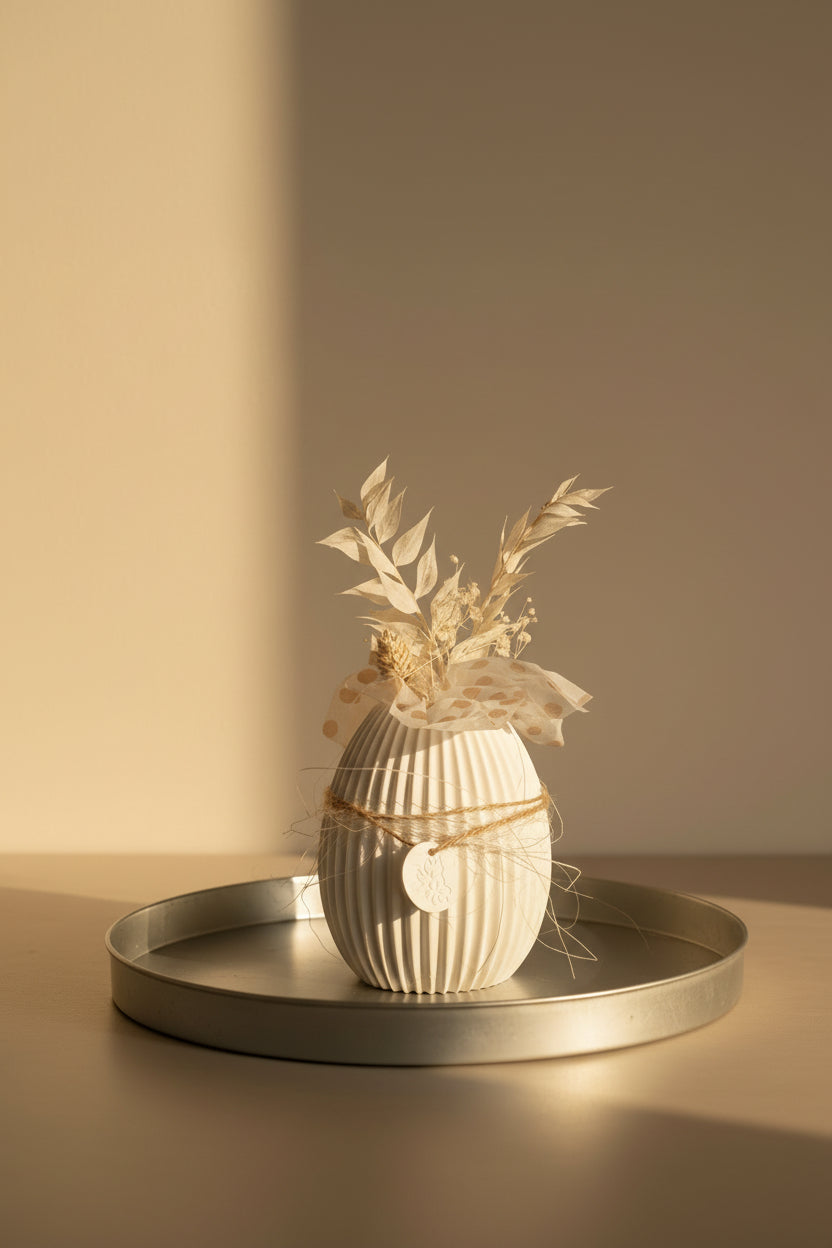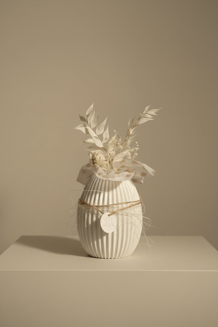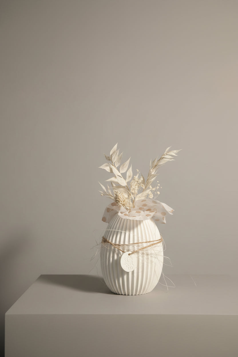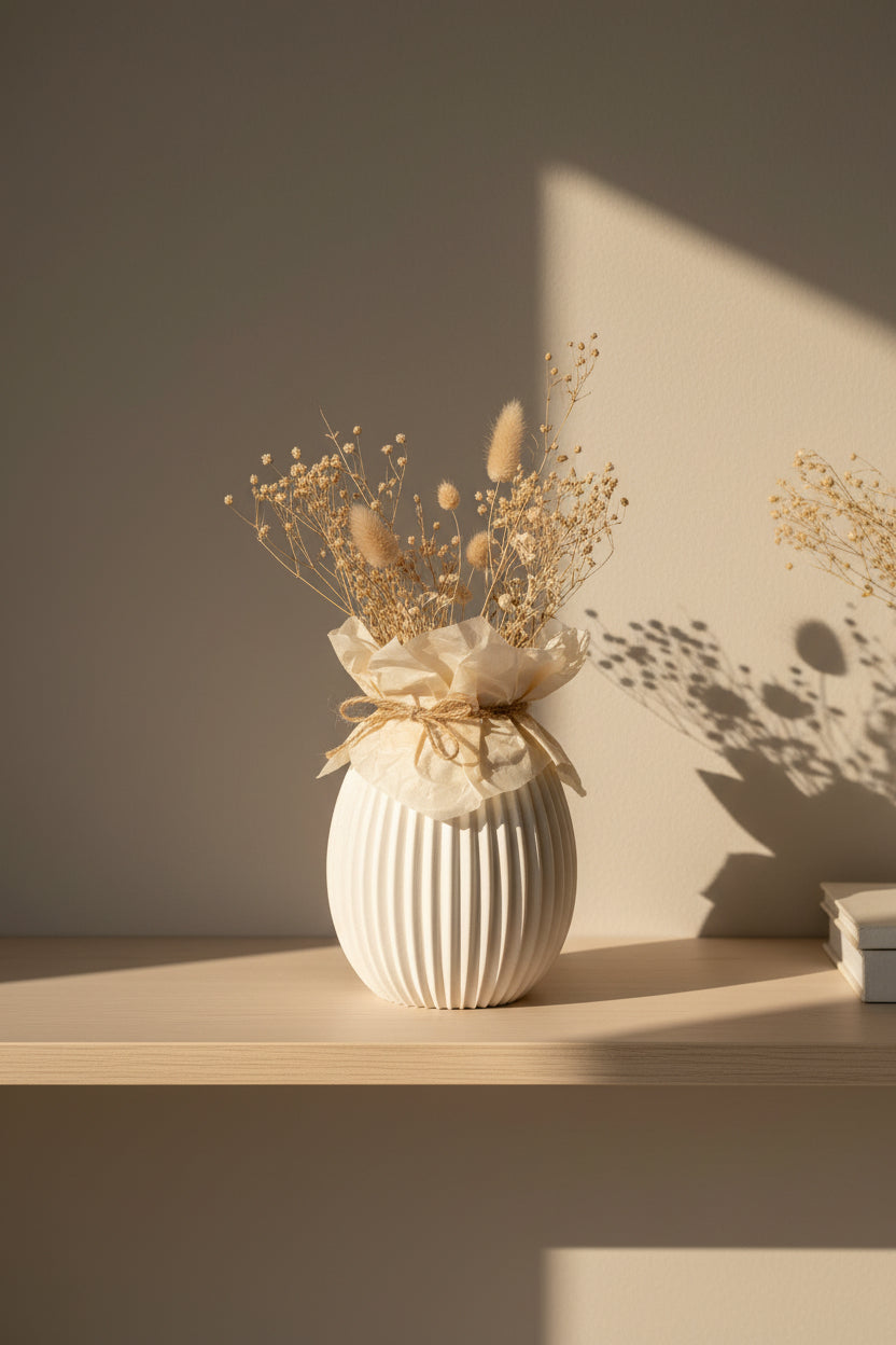 Die fertige Form eignet sich ideal für moderne, minimalistische Wohnkonzepte und lässt sich vielseitig einsetzen – pur als Dekoobjekt oder individuell weitergestaltet. Durch die Öffnung können problemlos Trockenblumen oder andere dezente Akzente ergänzt werden.