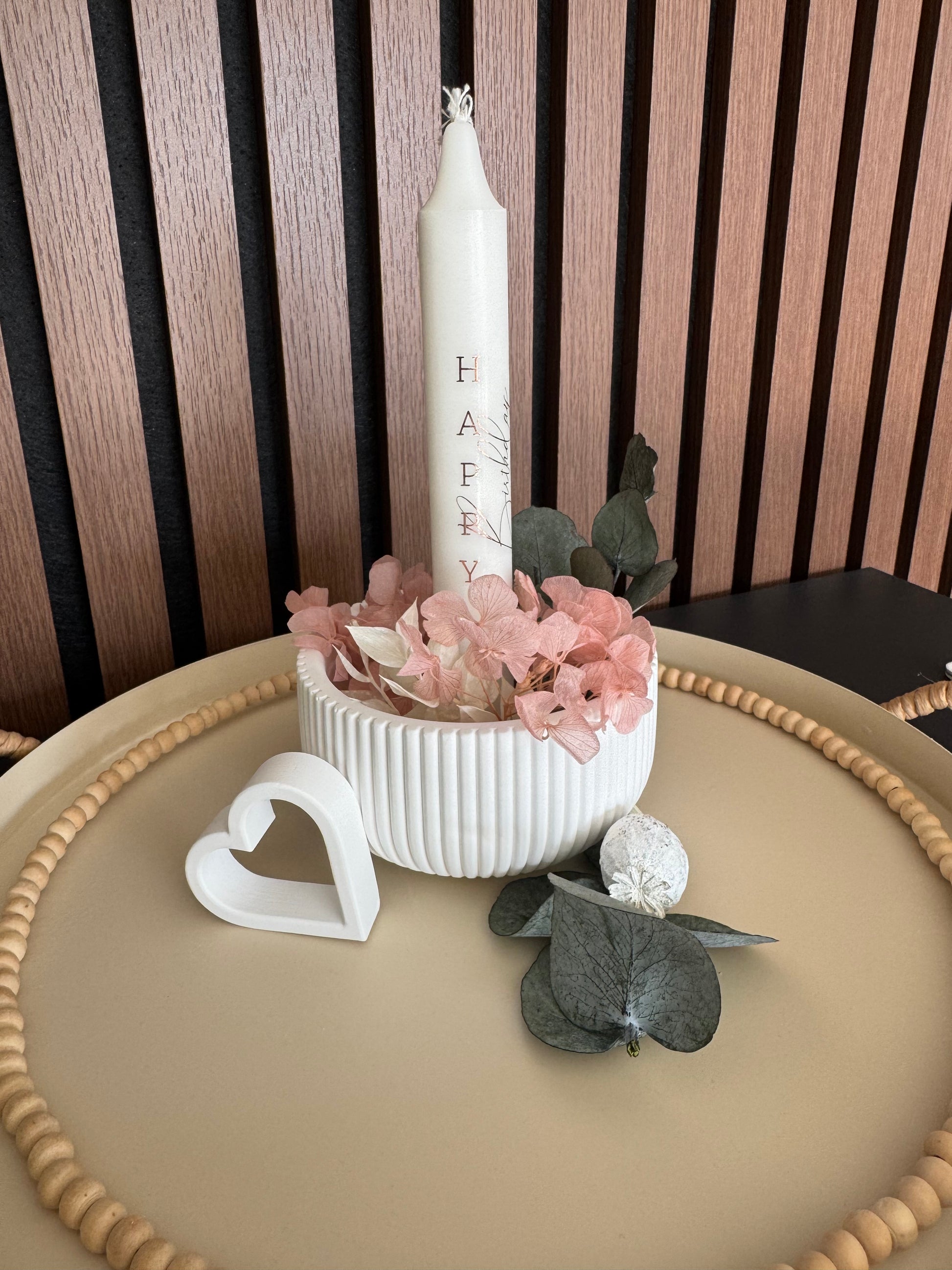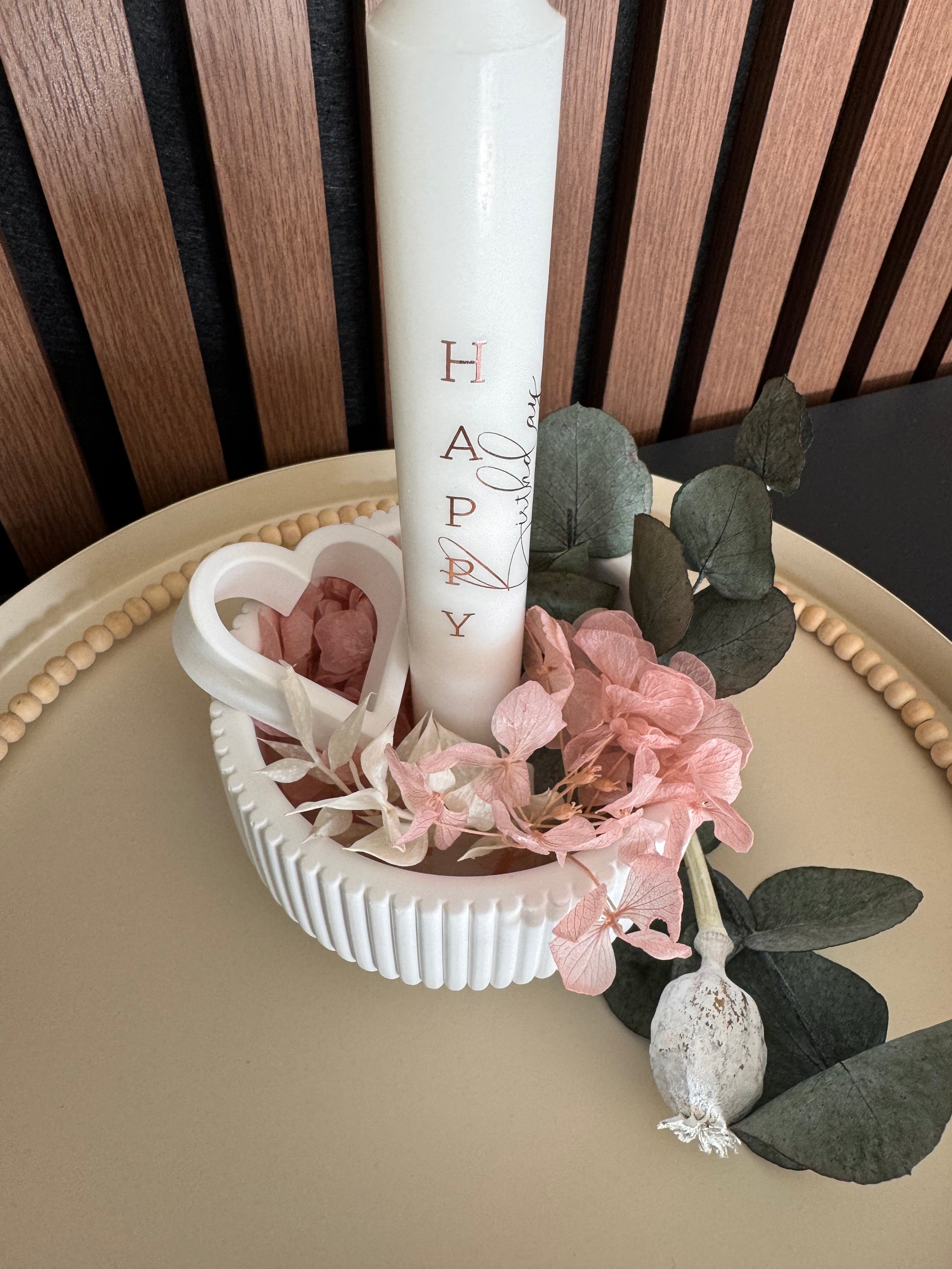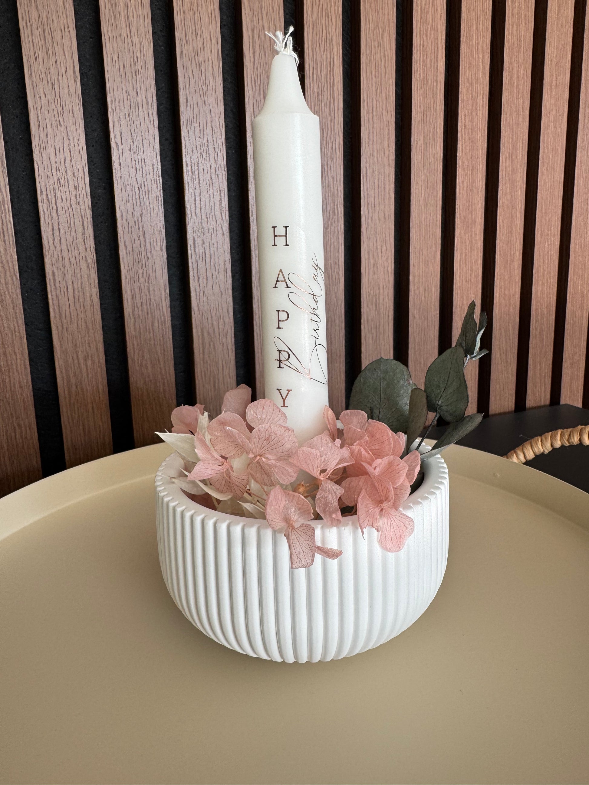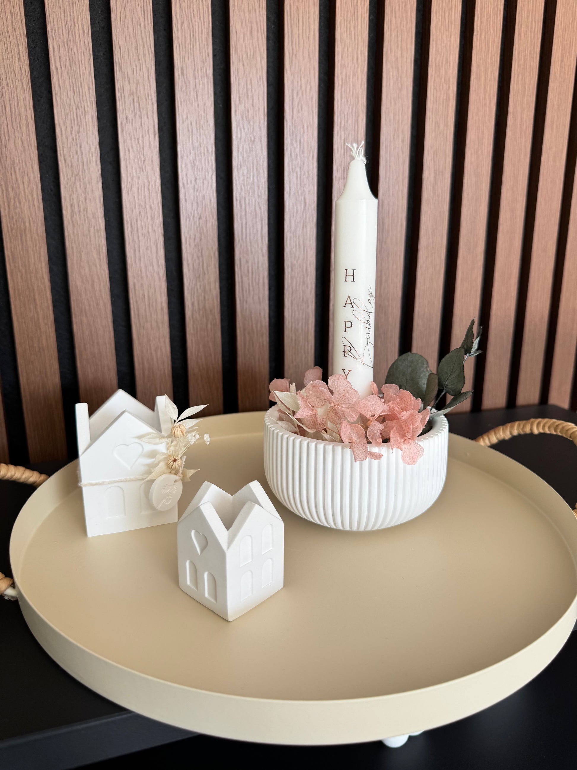 Moderne Schale mit festem Kerzenständer. Toll dekorierbar und zeitlos. Es passen gängige Kerzen von ca. 2-2,2cm rein.
