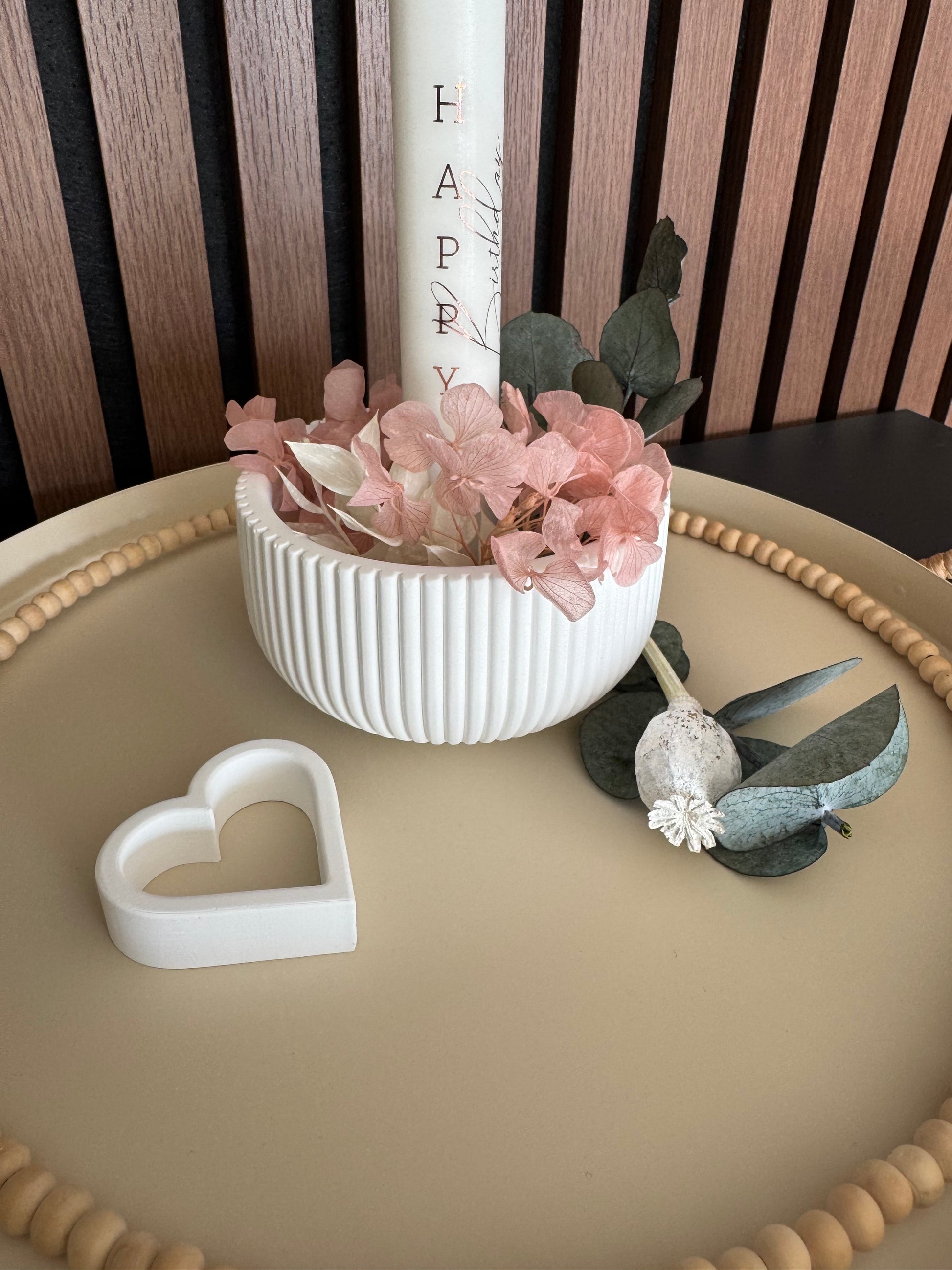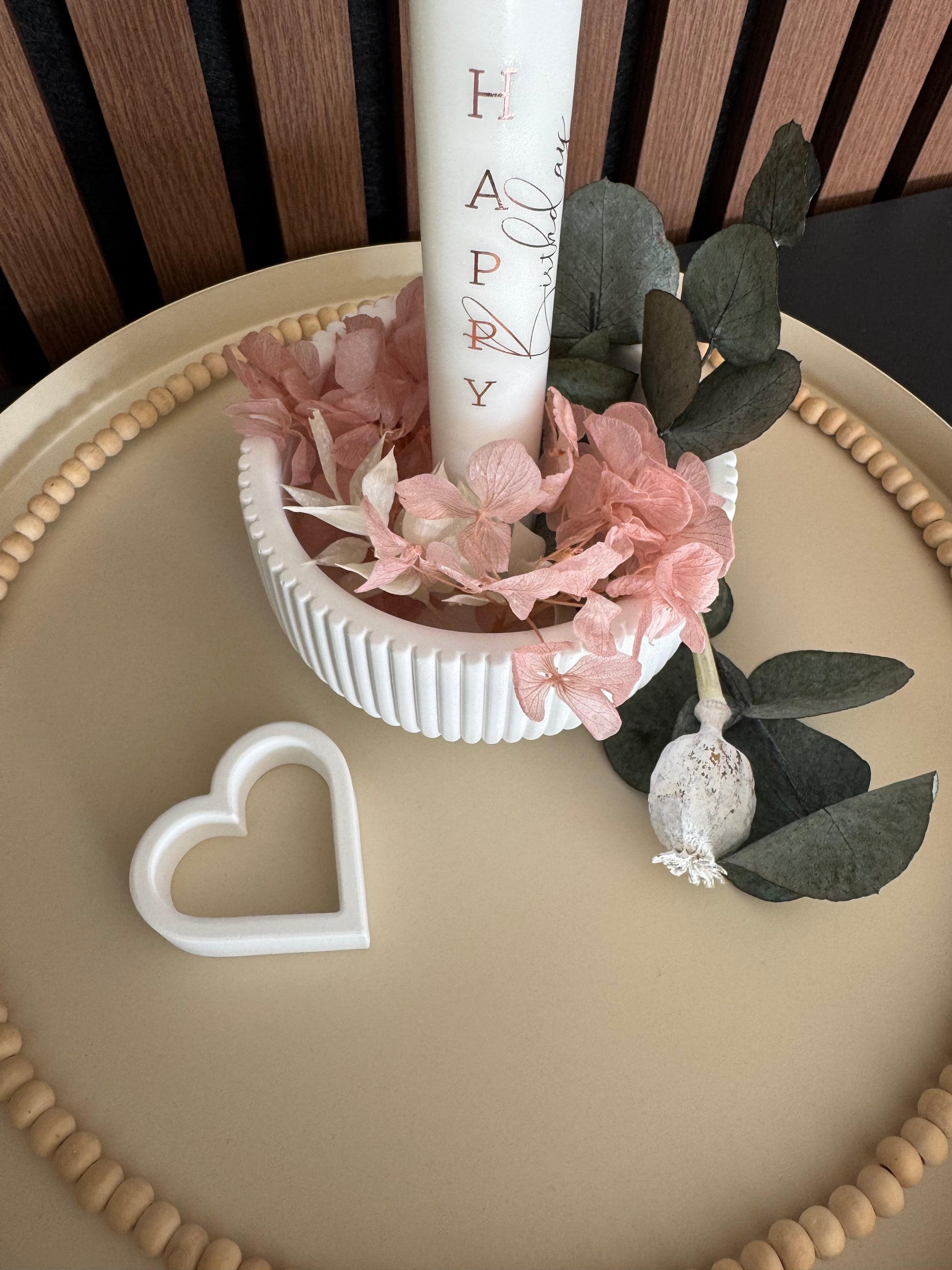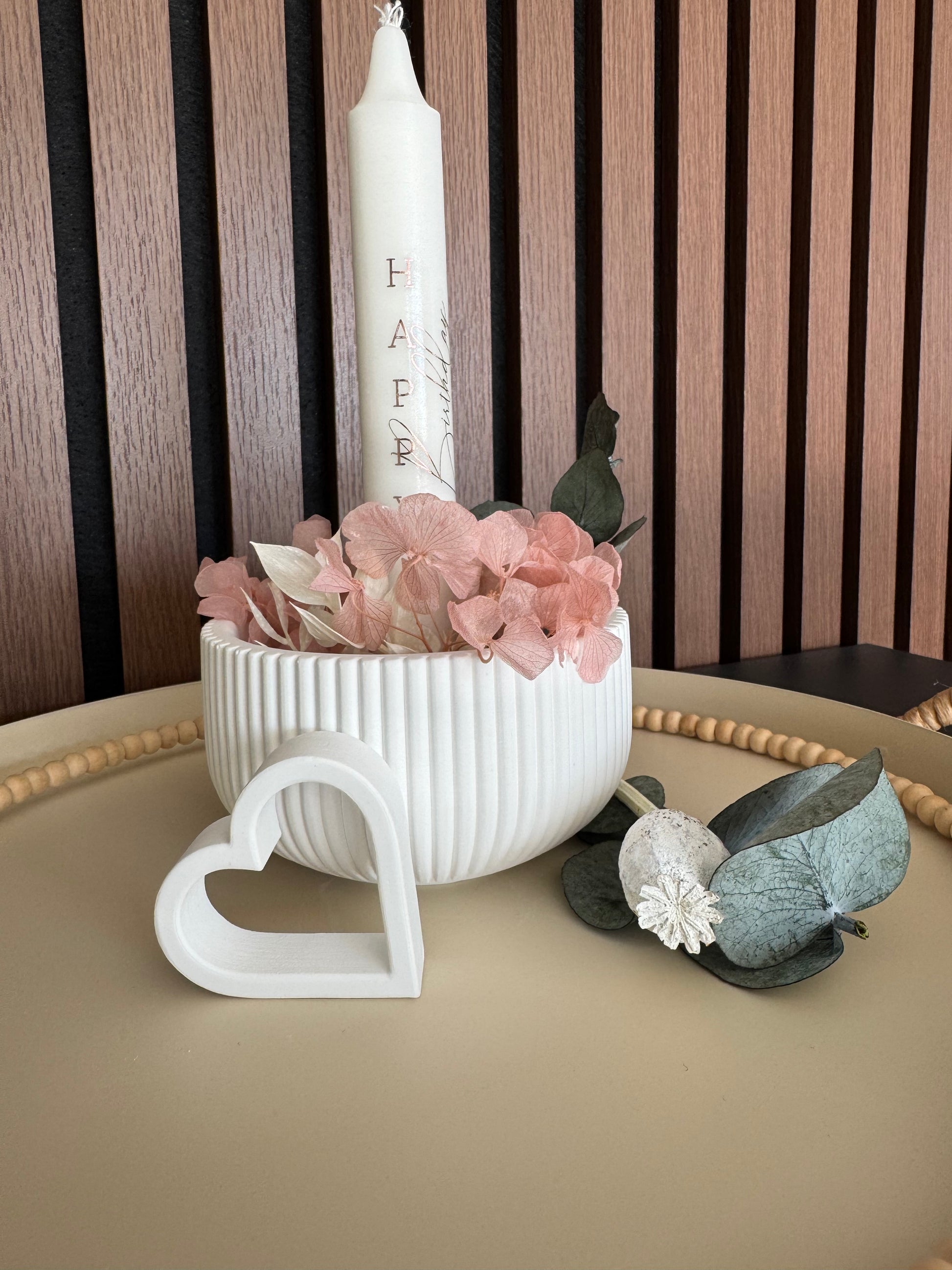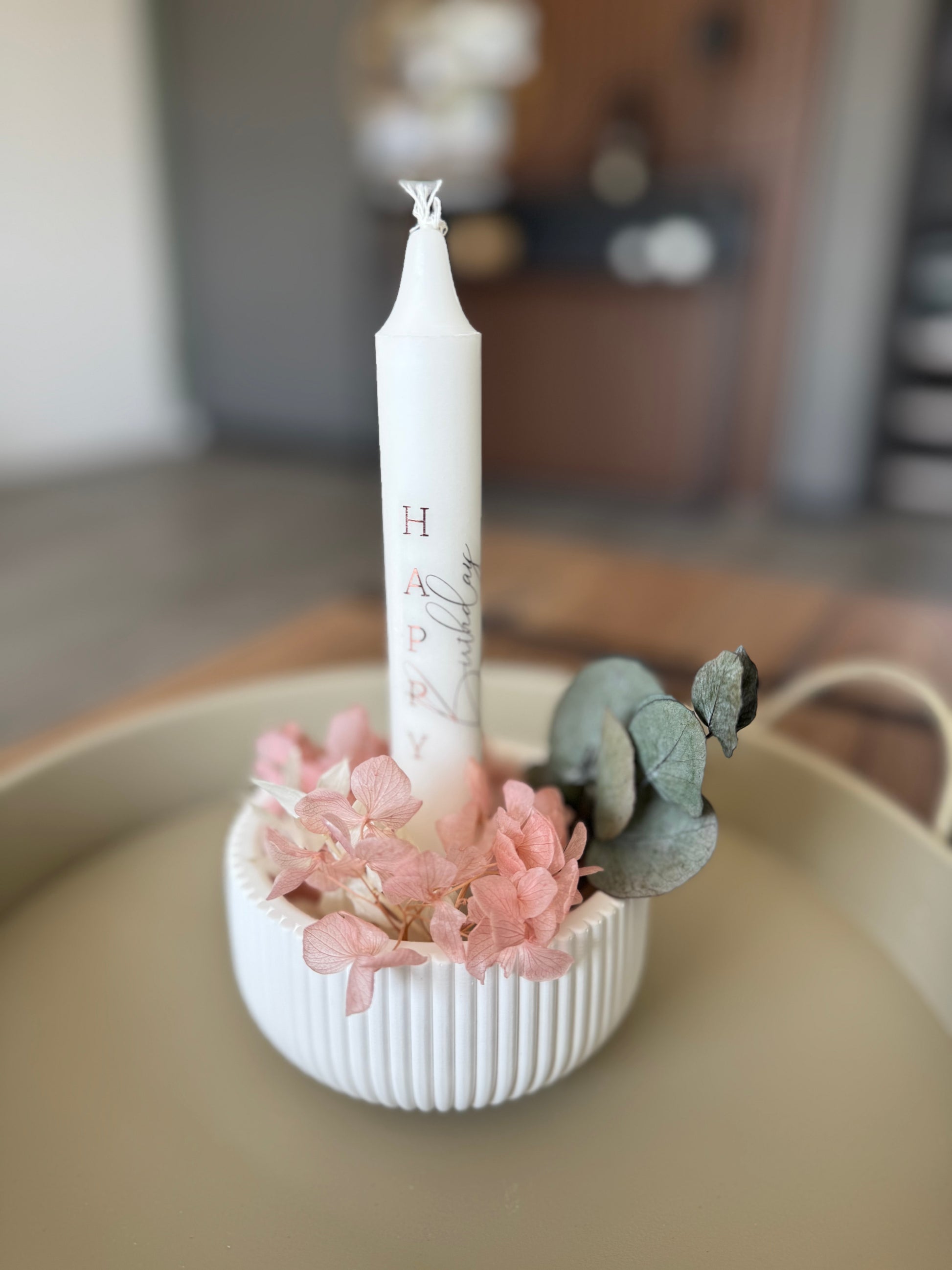 Moderne Schale mit festem Kerzenständer. Toll dekorierbar und zeitlos. Es passen gängige Kerzen von ca. 2-2,2cm rein.