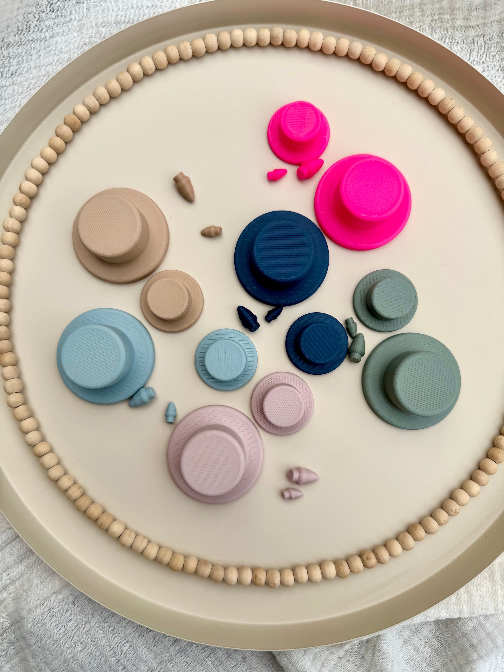 Da sich Materialien wie Raysin, Gips oder Beton beim Trocknen minimal zusammenziehen lassen – und auch Filamentteile aus dem 3D-Druck je nach Druckart geringfügige Unterschiede aufweisen – ist es möglich, dass die Accessoires nicht immer von alleine perfekt gehalten werden.