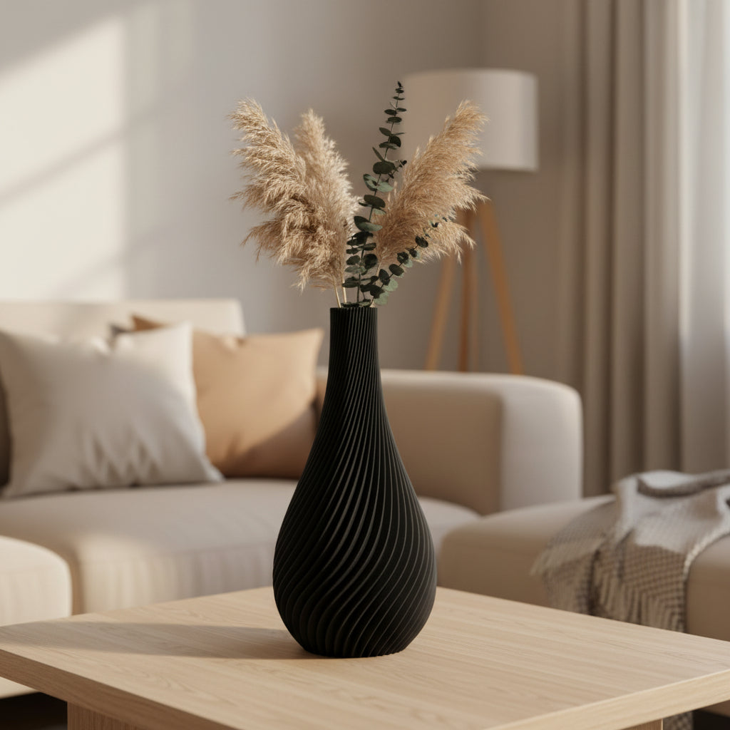 Diese moderne Spiralvase überzeugt durch ihre elegante Form und die dezente Bewegung in der Oberfläche. Sie wird im 3D-Druckverfahren Schicht für Schicht aufgebaut, wodurch die charakteristische Spiralkontur entsteht. Das matte Finish im warmen Sandton lässt die Vase harmonisch und wertig wirken – ideal für moderne Einrichtungskonzepte.