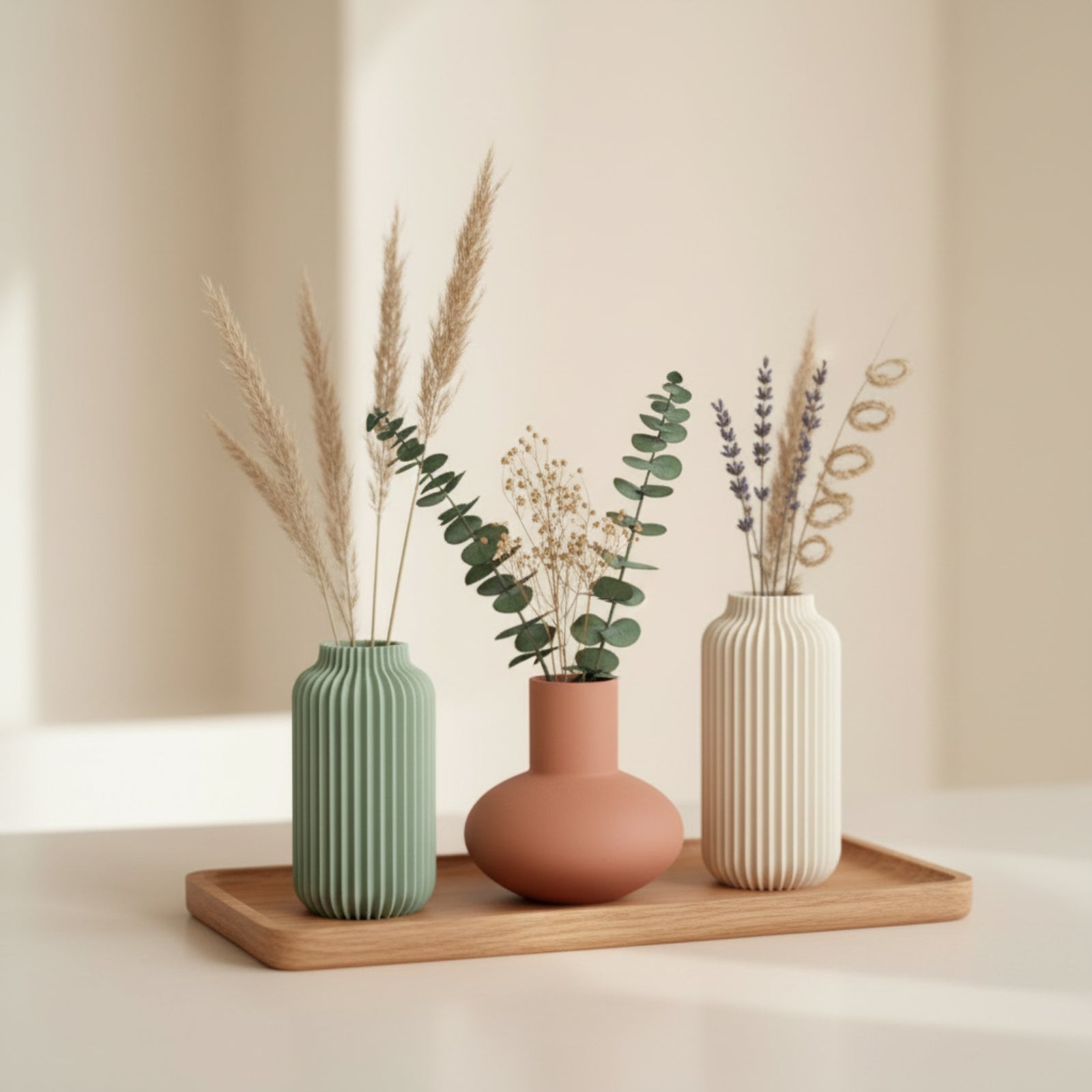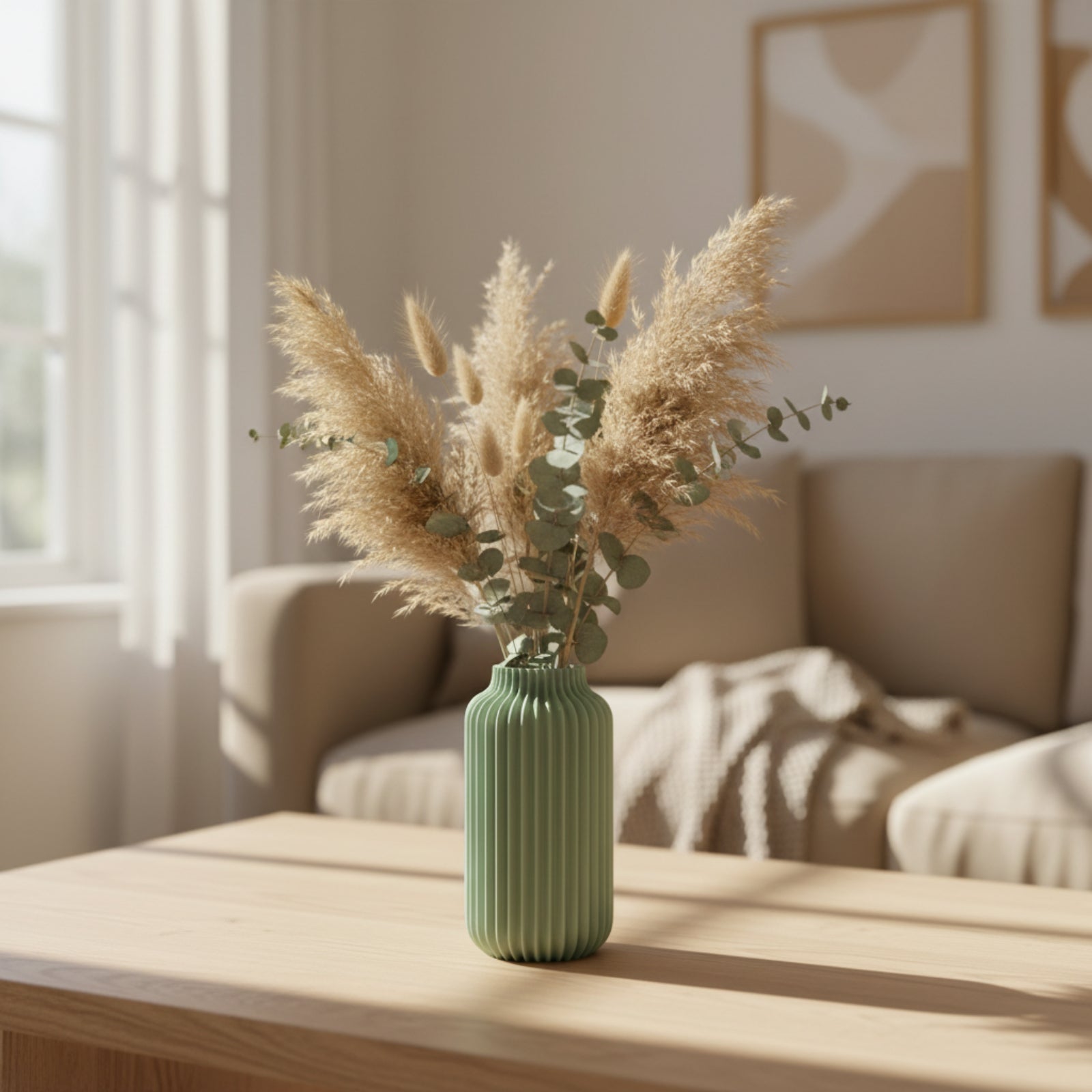 Die Vase eignet sich ideal für Trockenblumen, Eukalyptus, Pampasgras oder einzelne frische Blumenstiele. Dank der stabilen Wandstärke und der hochwertigen Materialverarbeitung steht sie sicher und fügt sich perfekt in moderne, skandinavische und minimalistische Wohnumgebungen ein.